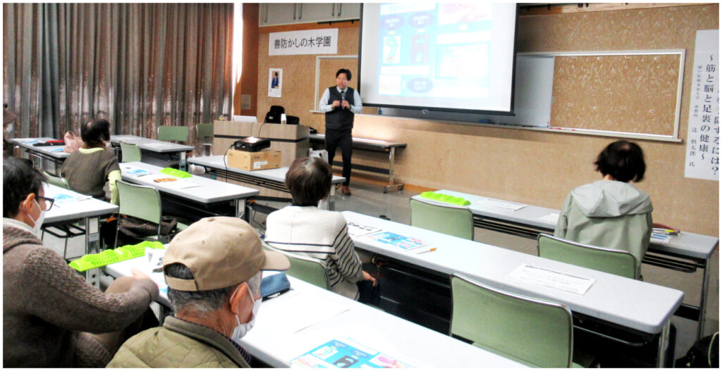 先日、本学教員の辻先生が加西市主催 シニアカレッジ「善防かしの木学園」に、身体フレイルを予防するには~筋と脳と足裏の健康~をテーマに講演をされました。