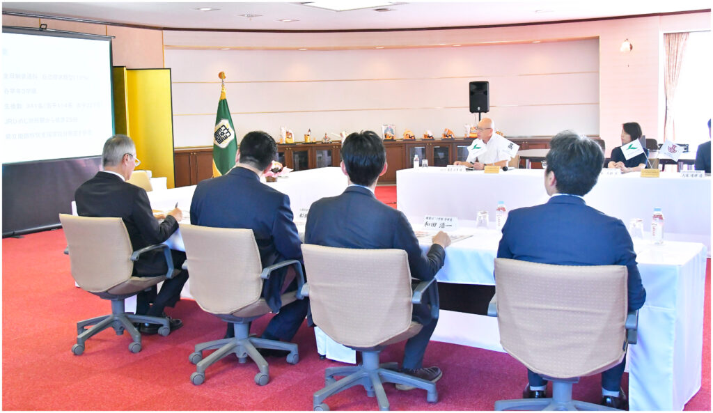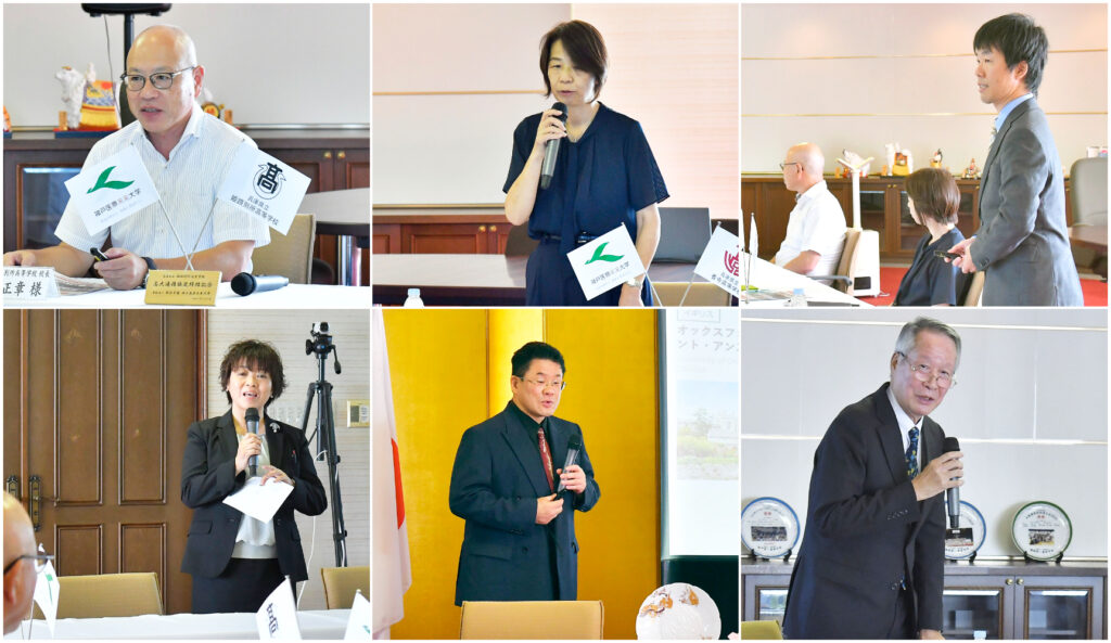 本学からは、鎌田積学長、人間社会学部学部長 船橋伸一先生、健康スポーツ学部学部長 和田浩一先生、連携事業担当 小田栄子先生、西田重康先生、中川守先生が出席いたしました。