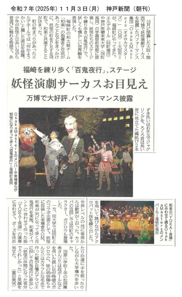 福崎町とのコラボ企画で、OsakaMastersと和太鼓チーム和楽と一緒に 今年度の学祭前夜祭で実現した百鬼夜行が、神戸新聞に掲載されました。