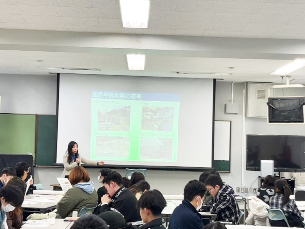 震災のようないざという時、長田高校が避難所になる予定です。正井先生から能登半島地震で高校生が避難所の受付をした事例や避難所生活では生活空間に制限が生じたり、衛生状態が著しく悪化し健康問題を生じたりするという現実的な課題を聴くことができました。