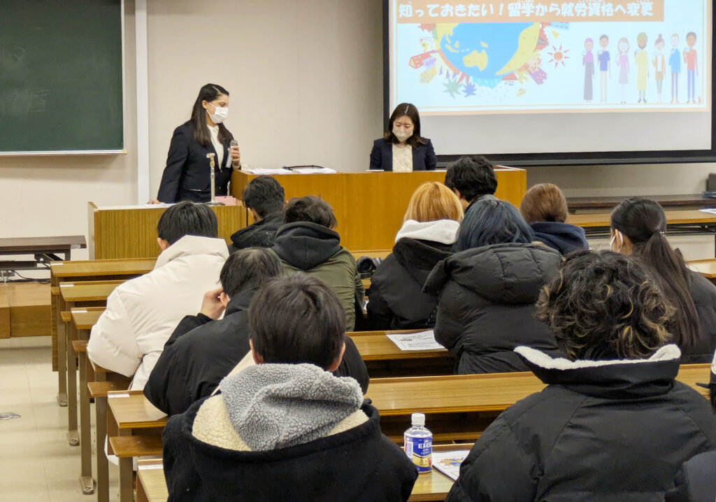 今回は、ルポゼソリューション株式会社(IKOIGROUP)にお越しいただき2年生留学生を対象に、今後の就活を行う上での重要となる「就労資格の種類」ついてセミナーを実施しました。